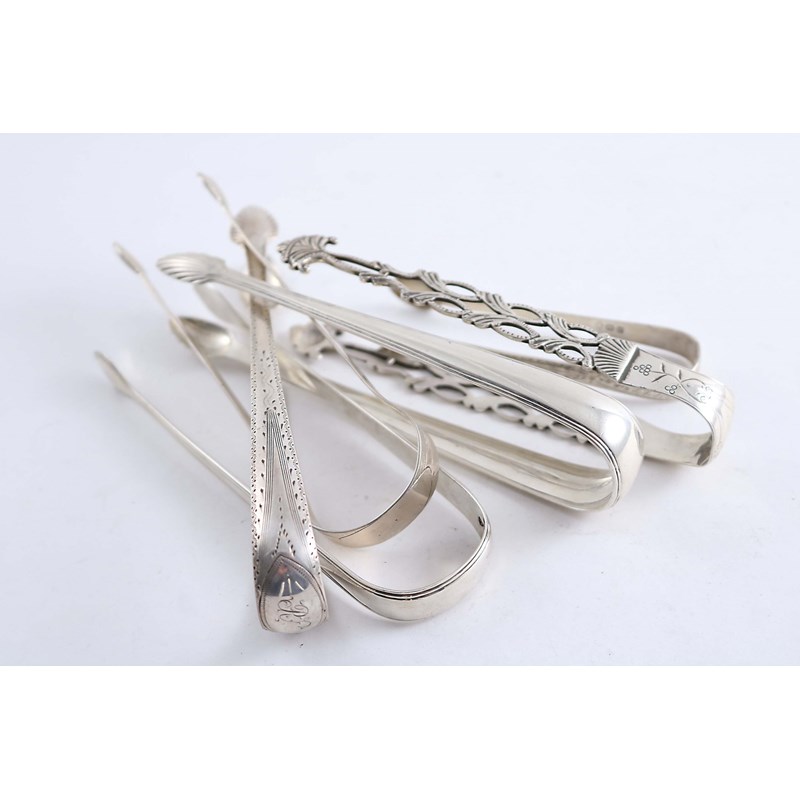 SIX ASSORTED PAIRS OF SUGAR TONGS (including two Irish pairs and an Italian pair); 6.4 oz (6)