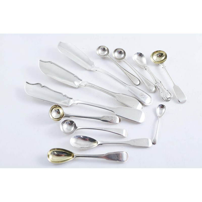 crested, by Richard Crossley & George Smith, London 1808, nine other various egg/condiment spoons (two crested) and three various butter knives (one crested); 10.75 oz (13)