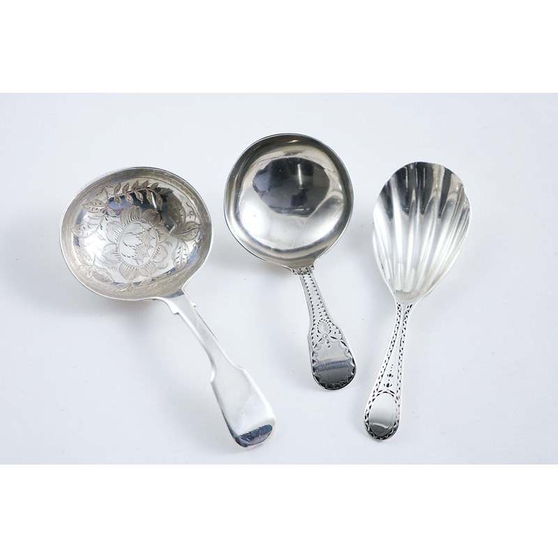 with a bright-engraved Fiddle stem, by Elizabeth Morley, London 1805, another George III bright-cut caddy spoon, and a William IV Fiddle caddy spoon with an engraved bowl, by J.H. Daniel, London 1834; 1.1 oz (3)