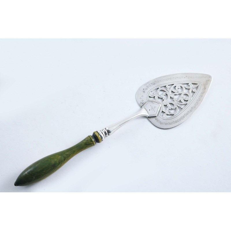 A GEORGE III BUTTER SPADE with a pierced and engraved blade and a green-stained, turned ivory handle, no maker's mark, London 1789; 6.5" (16.5 cms) long
