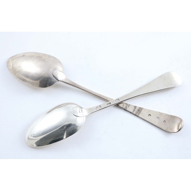 Hanoverian pattern, scratched with the initials "AMD", by Coline Allen of Aberdeen (CA, three towers, e), c.1760 and an Old English pattern table spoon, initialled "M", by James Erskine of Aberdeen; 3.8 oz (2)