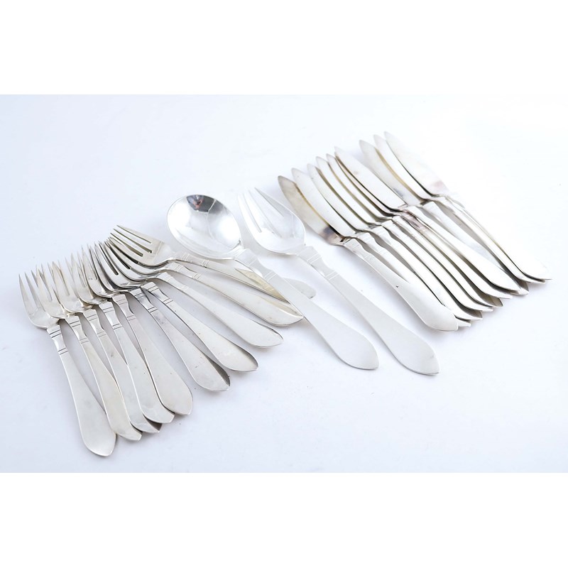 A set of six early 20th century Danish Continental (Antik) pattern fish knives & forks with English import marks for London 1923/25 together with four later forks and four later knives to match (no import marks) and a pair of salad servers in the same pattern with English import marks for London 1923; 35.5 oz (22)