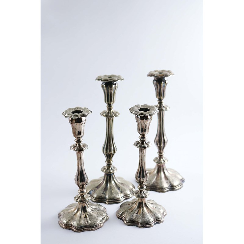 with engraved decoration and a slightly smaller pair of plated candlesticks to match; the larger pair 11.5" (29.3 cms) high (4)