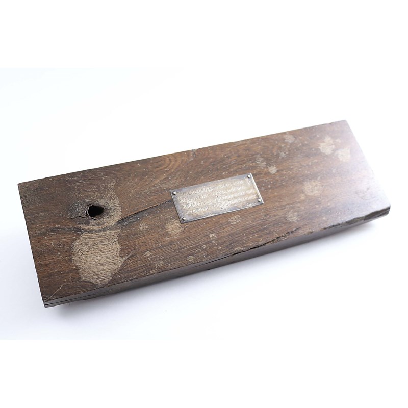 An Edwardian Scottish section of an oak beam, set with an inscribed plaque "Piece of oak taken from auld Brig O'Ayr, during presentation operations 1907-10, Brig erected beginning of 13th century", the plaque stamped with the marks of John Lyle, Ayr (J.Lyl, Ayr) 1907-10; 13.3" (34 cms) long overall