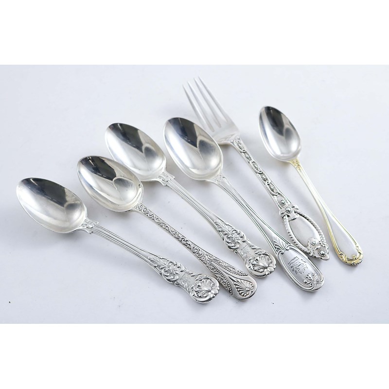 A Wellington pattern tea spoon, crested, a parcelgilt Tamworth pattern tea spoon, a Newton pattern tea spoon (with French duty mark), a pair of Dolphin pattern tea spoons, crested, & a dessert fork in an unnamed pattern with rope chain links up the stem & acorns on the heel, all of the above by George Adams, London, mixed dates 1844-1880; 6.7 oz (6)