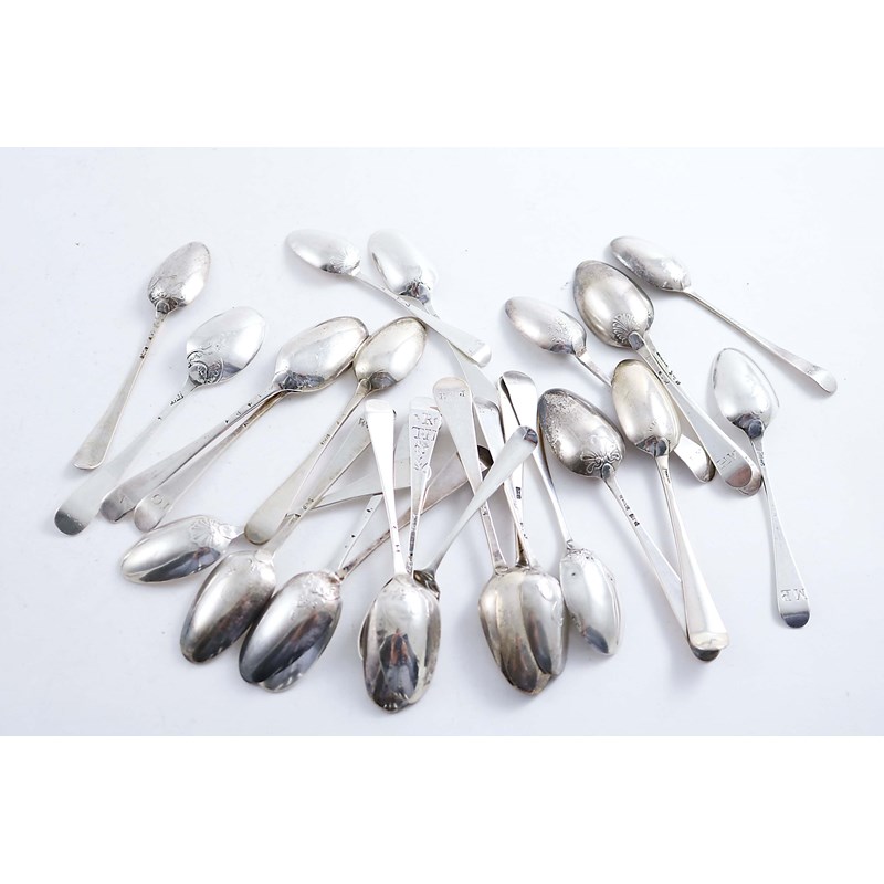 TWENTY FIVE VARIOUS GEORGE II / III FANCYBACK TEA SPOONS (shells, scrolls, baskets of flowers), most pieces with initials; 8.3 oz (25)