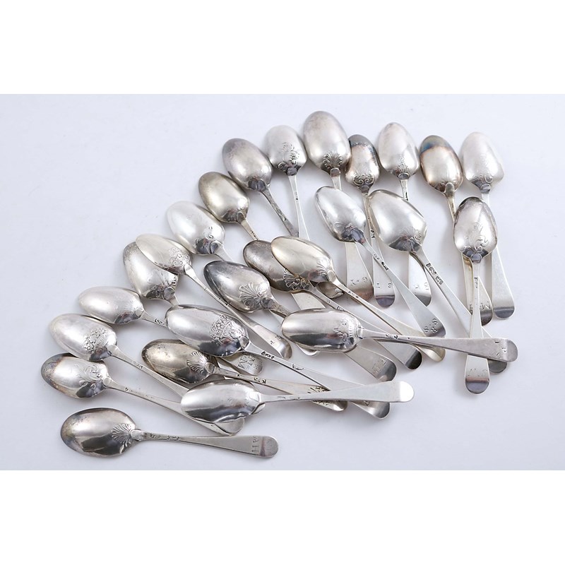 TWENTY FIVE VARIOUS GEORGE II / III FANCY BACK TEA SPOONS (shells, scrolls, baskets of flowers), most pieces with initials; 8.2 oz (25)
