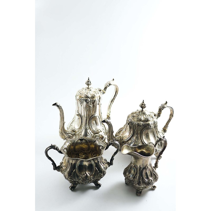 with scroll handles, scroll feet and matted leaf decoration around the bodies, vacant scroll cartouches, by Henry Wilkinson & Co., Sheffield 1852;  the coffee pot 10.3"  (26 cms) high;  76.4 oz  (4)