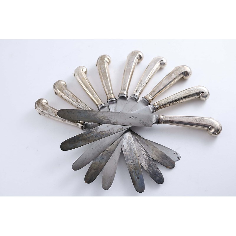 A MATCHED SET OF NINE GEORGE II / III TABLE KNIVES with octagonal pistol handles (slight variations in form) and steel fingerpoint blades, crested, maker's mark unclear, London 1755-65; 10" (25.4 cms) long (9)