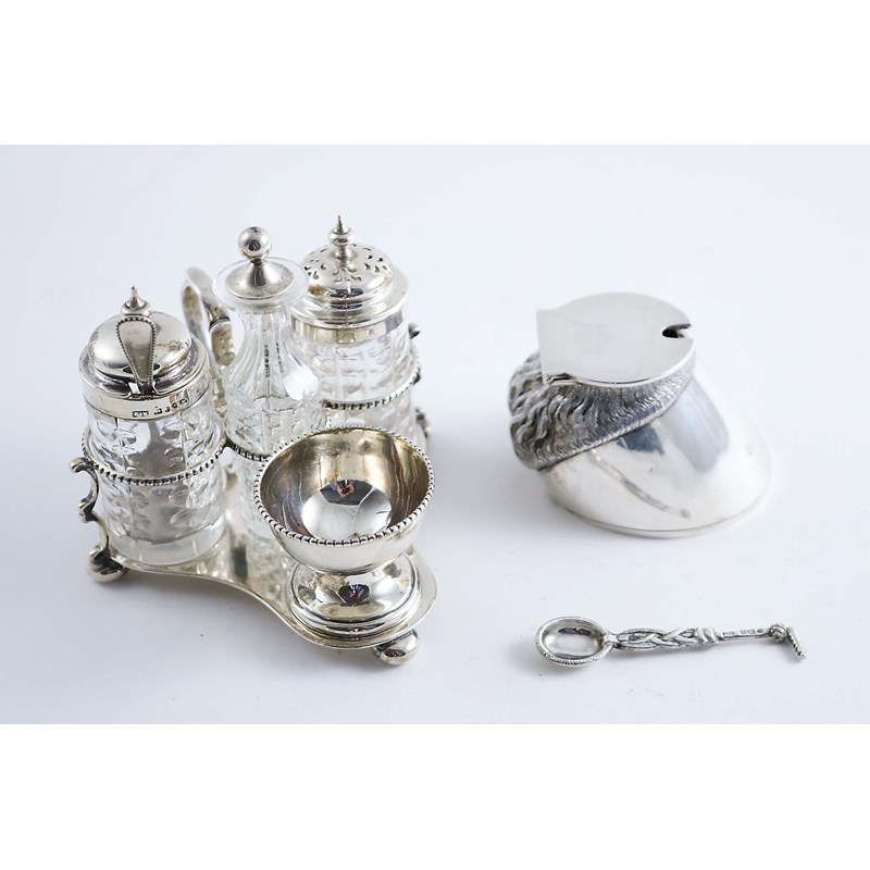 with a gilt interior and matching spoon, shaped like a riding crop, both by G.W. White & Co., London 1900 together with a Victorian, trefoil-shaped condiment set with three mounted glass bottles; the mustard pot 2" (5 cms) high; 11 oz weighable silver (3)