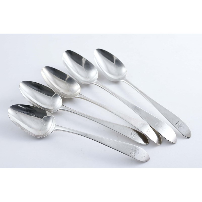 FIVE VARIOUS GEORGE III IRISH TABLE SPOONS with pointed ends, all crested, mixed makers & dates, Dublin 1791-1800; 9.3 oz (5)