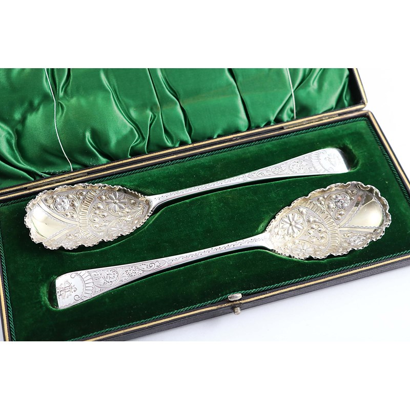 A LATE VICTORIAN CASED PAIR OF DECORATIVE BERRY OR FRUIT SERVING SPOONS with parcelgilt bowls, monogrammed, maker's mark "C&Co", Sheffield 1896; the spoons 8.75" (22 cms) long; 5.25 oz