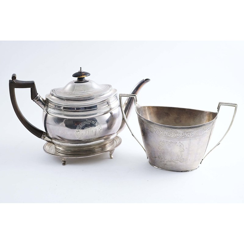 with reed borders & engraving, by Robert & David Hennell, London 1799 together with an engraved tea pot stand by George Smith & Thomas Hayter, London 1795 and an engraved, two-handled sugar bowl by John Emes, London 1798, all of the above initialled to match; the tea pot 6.25" (16 cms) high; 29.1 oz 93)