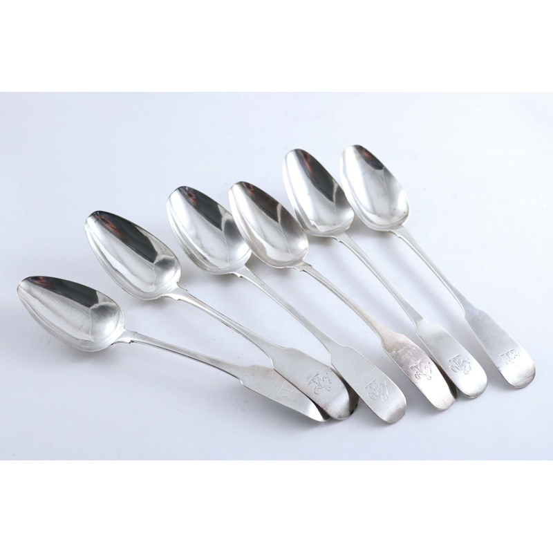 A MATCHED OR HARLEQUIN SET OF SIX GEORGE III IRISH TABLE SPOONS Fiddle pattern, all crested to match, by various makers, Dublin 1806-1816; 12.1 oz (6)