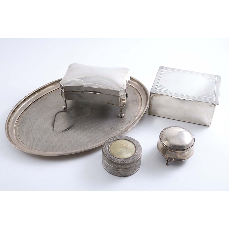 with engine-turned decoration, by Synyer & Beddoes, Birmingham 1942, an Art Deco cigarette box (wood lines), London 1934, a jewel box on four legs (lined & loaded), a small circular jewel box (lined) and a small circular Persian box with inset print and a mirror inside the cover; the tray 11.25" (28.7 cms) long; 10.75 oz weighable silver (5)
