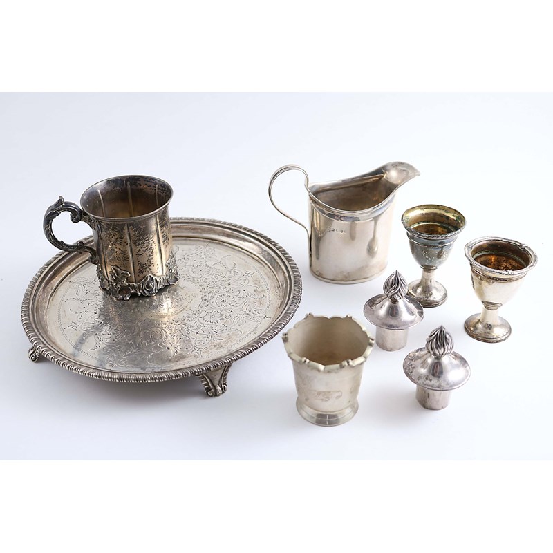 A George III small circular salver with a gadrooned border and a later inscription & engraving in the centre, by John & Edward Edwards, London 1815, a George III cream jug, initialled, a Victorian Christening mug and five small plated items; the slaver 8.75" (22 cms) diameter; 25.2 oz weighable silver (8)