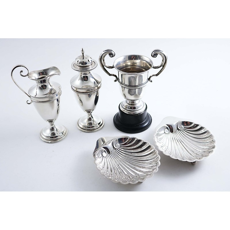 A MIXED LOT:- An Edwardian vase-shaped cream jug & matching sugar caster, a small two-handled cup on a wooden plinth, and a pair of butter shells; the latter 4.25" (10.5 cms) diameter; 16.3 oz (5)