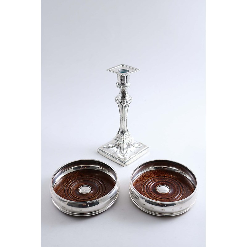 with turned wooden bases & central bosses, by John Bull Ltd., London 1903 and a single, late Victorian candlestick; the latter 7.75" (19.5 cms) high (3)