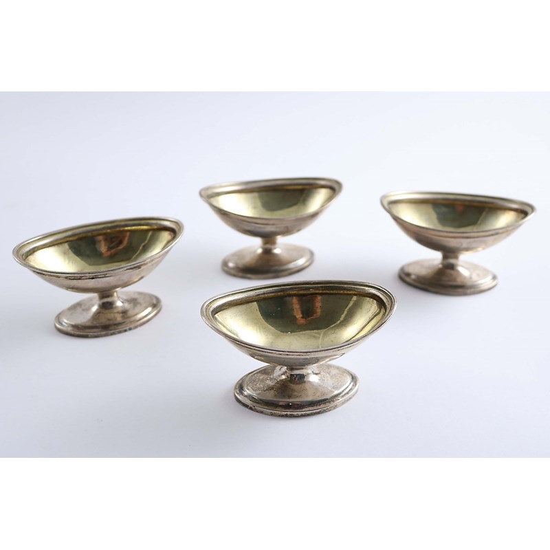A SET OF FOUR GEORGE III NAVETTE-SHAPED SALTS on pedestal bases, with gilt interiors, crested, maker's marks very worn, London 1796; 4" (10 cms) long; 11 oz (4)