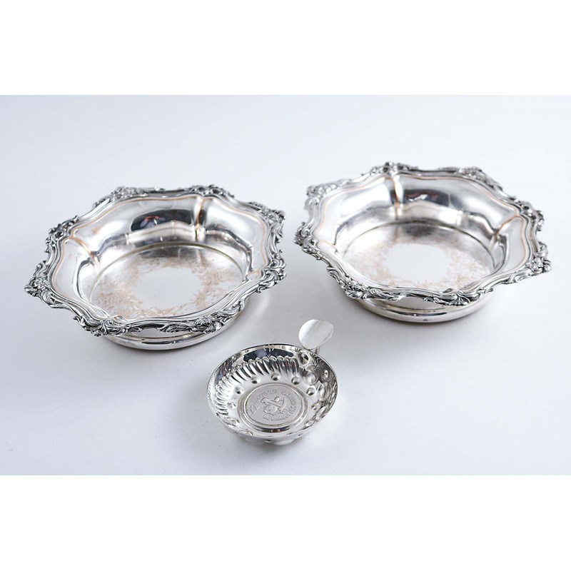 of shaped octagonal outline with everting floral rims, inset wooden bases and flat-chasing in the centres, together with a plated wine taster; the coasters 8" (20 cms) diameter (3)