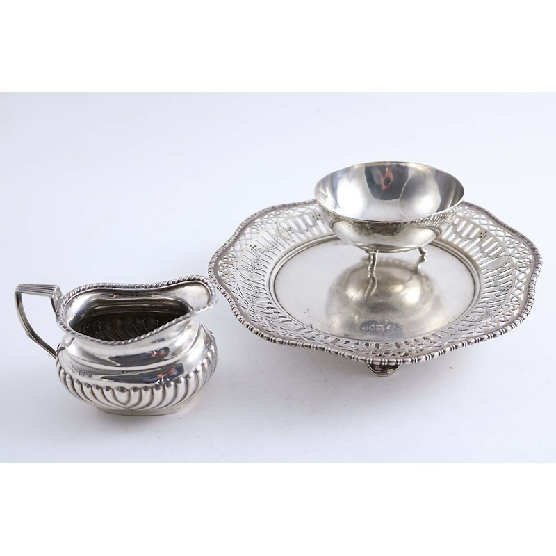 A PIERCED DISH on four feet by the Goldsmiths & Silversmiths Co. Ltd., London 1910, a small, part-fluted cream jug, and a small Cypriot bowl on three feet; the latter 3.7" (9 cms) diameter; 14.4 oz (3)
