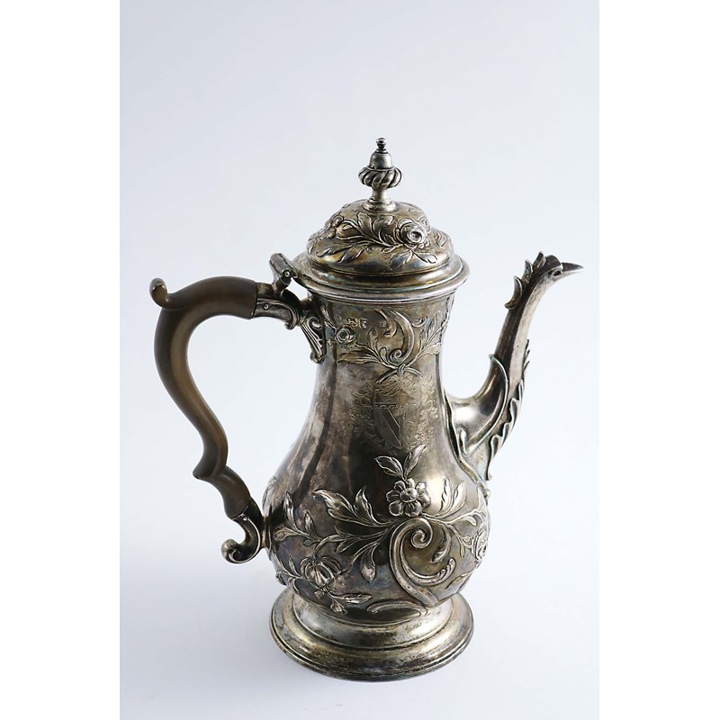 with repousse-work, floral scrolls around the cover, and the upper & lower body engraved on one side with a coat of arms, with a leaf wrapped spout and a knop finial, maker's mark unclear, London 1767; 10.9" (275 cms) high; 28.1 oz
