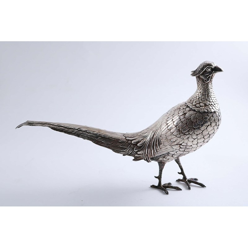 in the form of a cock pheasant, in a strutting pose, with textured plumage and a detachable head, B. Neresheimer of Hanau with English import marks for London 1910; 13.5" (34.5 cms) long; 20 oz