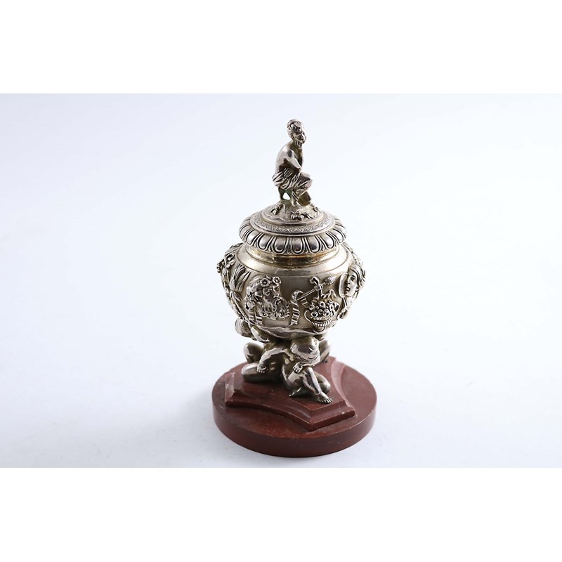 on a pale red, hardstone base with a detachable cover and a figure finial, apparently unmarked, possibly Italian; 6.4" (16.3 cms) high