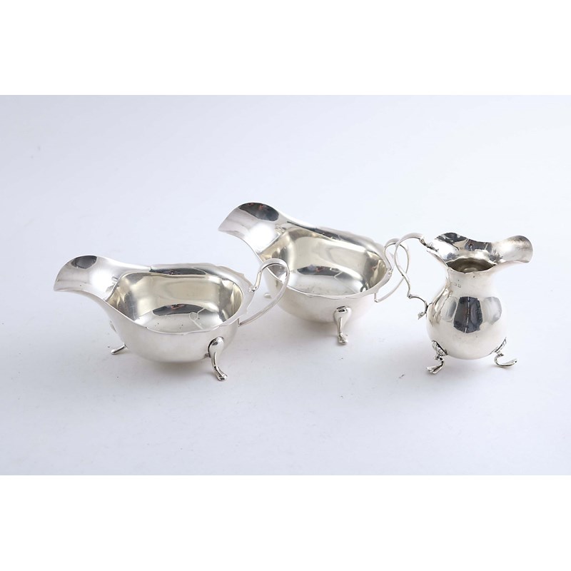A PAIR OF SAUCE BOATS on three legs by E. Viner of Sheffield 1931 and a small Edwardian cream jug; the latter 3.25" (8.2 cms) high; 9.1 oz (3)