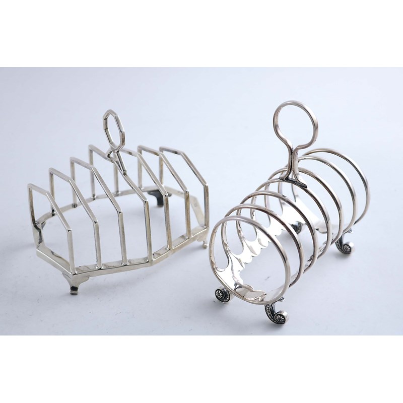 on scroll feet, by James Dixon & sons, Sheffield 1899 and an octagonal toast rack with angular bars by Mappin & Webb, Birmingham 1926; the latter 5.1" (13 cms) long; 11.25 oz (2)