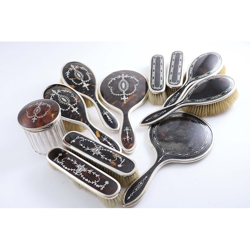 A SIX-PIECE MOUNTED TORTOISESHELL DRESSING TABLE SET