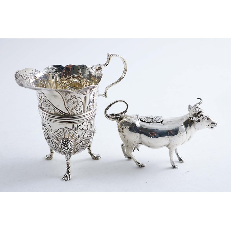 with English import marks for London 1907 and a late Victorian cream jug in the style of an 18th century Irish example, by J.M. Banks, Birmingham 1894; the cow creamer 4.4" (11.3 cms) long; 7.3 oz