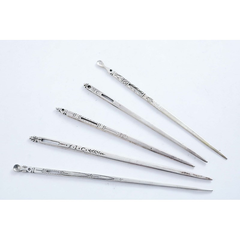 AN ELIZABETH I / JAMES I BODKIN with scratch engraving, a hole, a slot and an ear-pick at the end, pricked on one side with the initials "MB", unmarked 1580-1610; 5.5" (14 cms) long; 0.25 oz