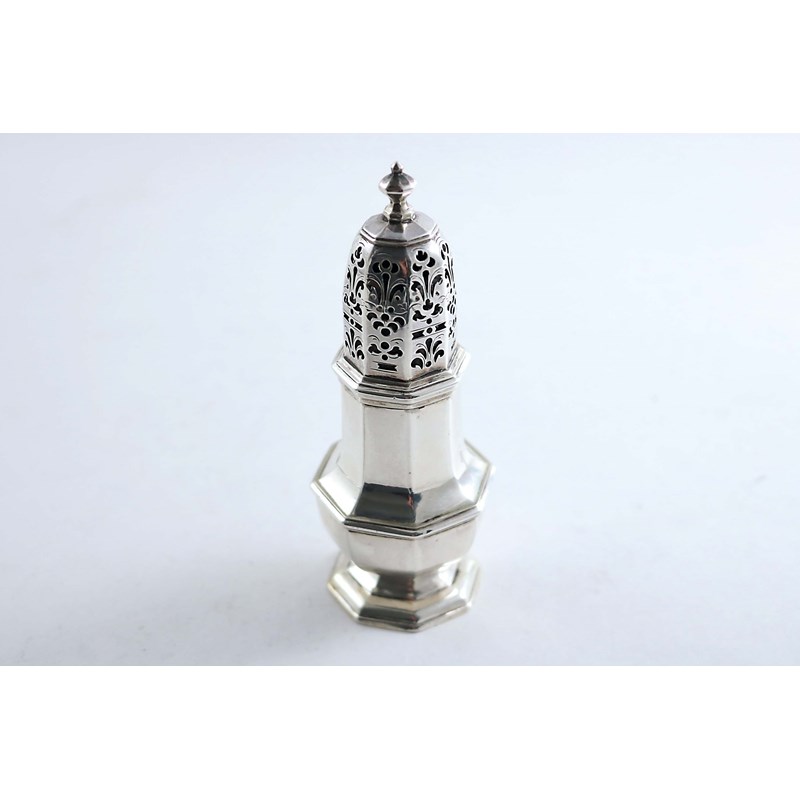 A GEORGE I / II OCTAGONAL PEPPER CASTER with a high-domed cover and a knop finial, by Thomas Bamford, London 1727; 5.2" (13 cms) high; 3.9 oz