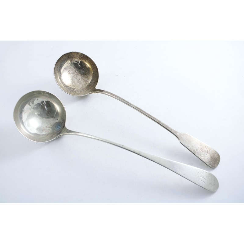 engraved crest & motto, by R. Gray & Sons, Glasgow 1835 and another Scottish soup ladle with a pointed end, initialled, by W&P. Cunningham, Edinburgh 1798; the latter 1.43" (36.3 cms) long; 13.9 oz (2)