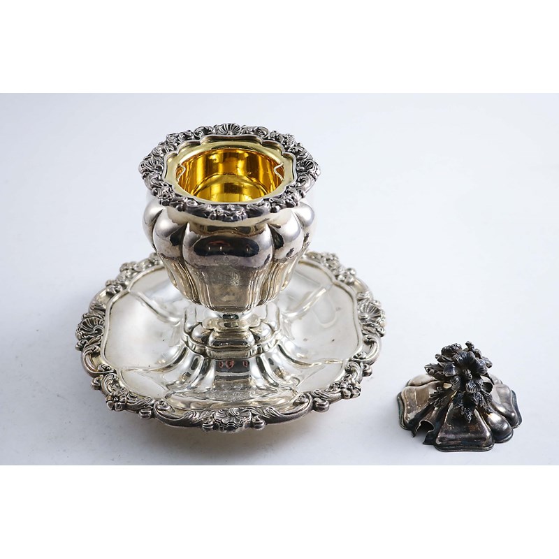 on an integral stand with husk & floral scroll borders, a lift-off cover with a flower finial and a drop-in, gilt liner, engraved on the stand and pot and liner with a coat of arms, no apparent maker's mark, Paris 1880-1900; 6.5" (16.5 cms) high overall; 18.75 oz