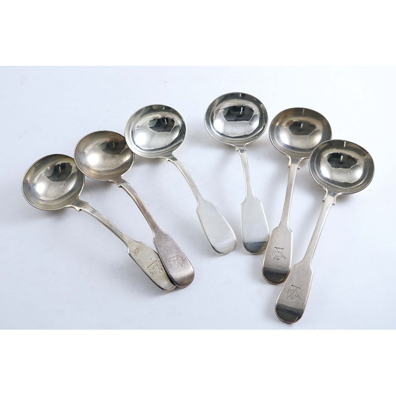 THREE PAIRS OF FIDDLE PATTERN SAUCE LADLES:-