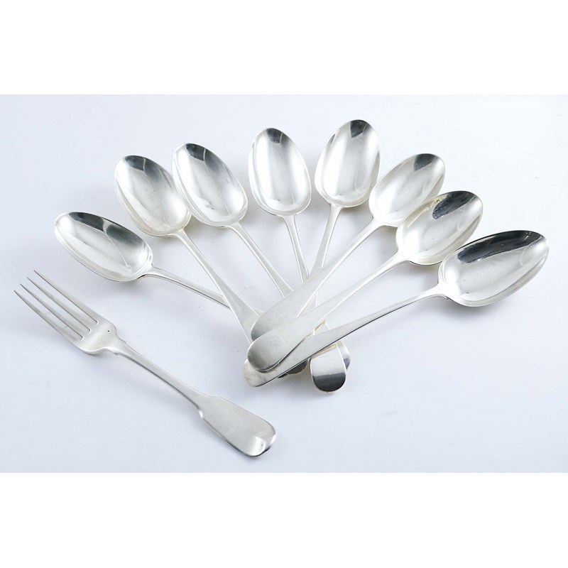 A set of five Victorian Old English pattern table spoons by George Adams, London 1861, another similar example by Elizabeth Eaton, London 1852 and a pair of table spoons with a drop on the back of the terminals, by George Adams, London 1860, all of the above crested and a Fiddle table fork by Messrs. Eley Fearn & Chawner, London 1809; 21 oz (9)