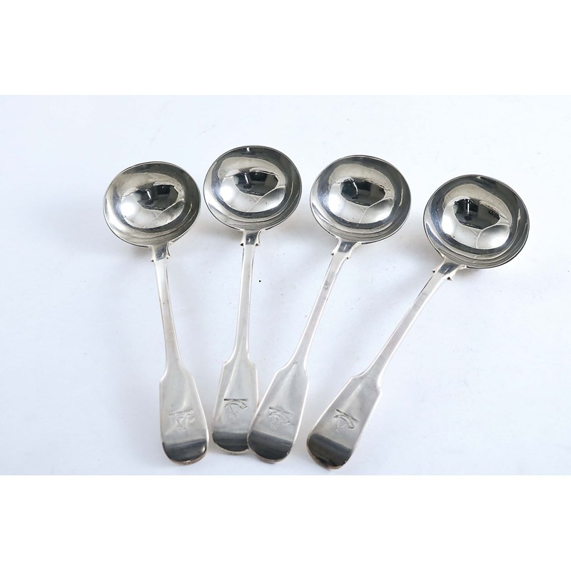 A SET OF FOUR VICTORIAN FIDDLE PATTERN SAUCE LADLES crested, by George Adams, London 1855; 7.9 oz (4)