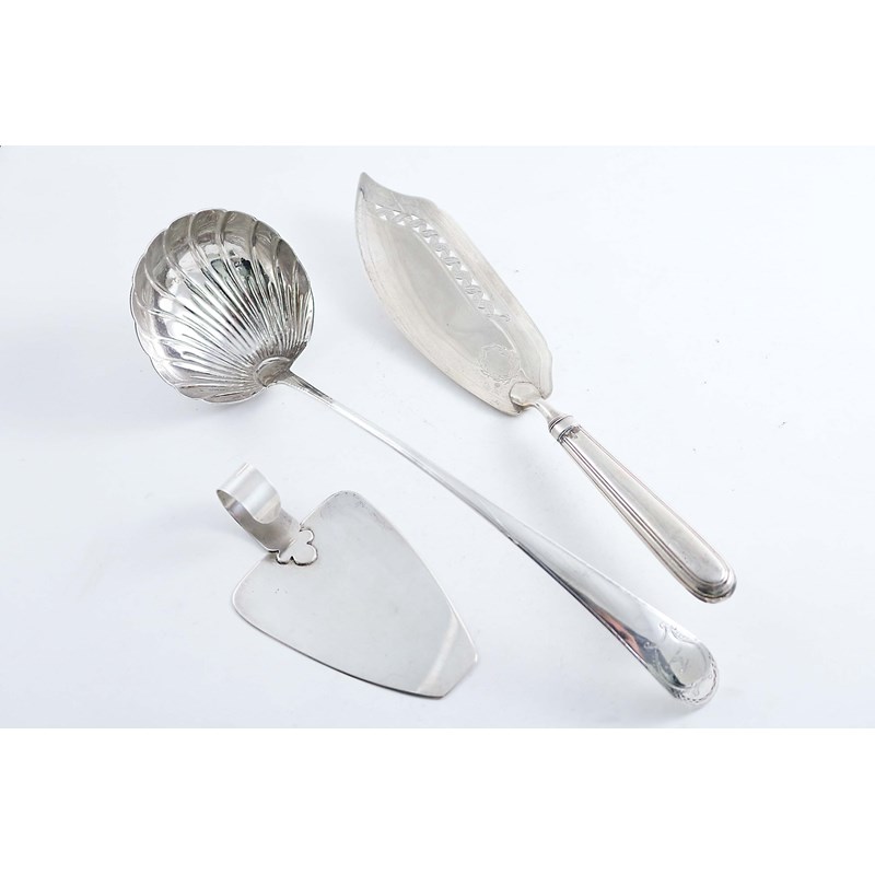 with a fluted circular bowl, crested, a George III fish slice with a loaded handle, and a late 20th century serving slice; the latter 5.5" (14 cms) long; 7 oz weighable silver (3)