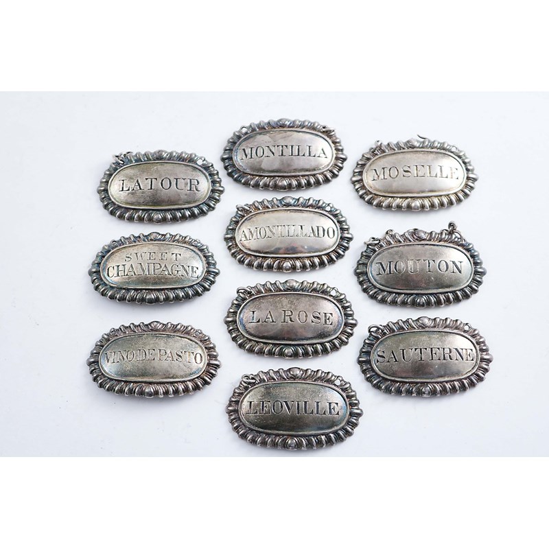"LATOUR", "MONTILLA", "LA ROSE", "VINO DE PASTO", "SAUTERNE", "MOUTON", "MOSELLE", "AMONTILLADO", "SWEET CHAMPAGNE" & "LEOVILLE" (two lacking their chains), by William Summers, London 1871; 2.1" (5.4 cms) long; 5.3 oz (10)