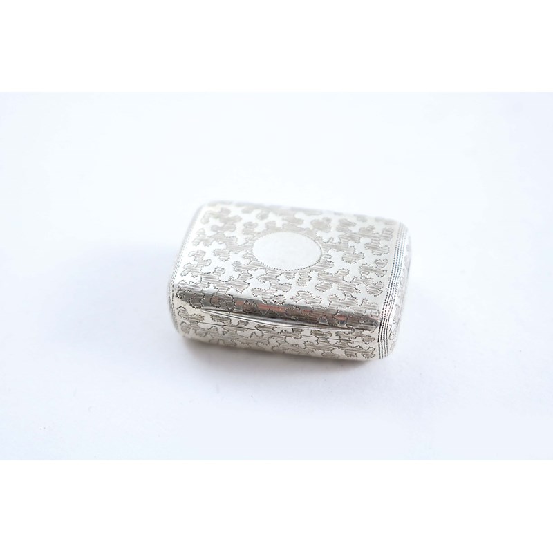 of rounded rectangular form with amoeba-like decoration & a vacant oval cartouche, the grille with a trophy of flags and drums, gilt interior, by Abstainando King, London 1805;  1.45"  (3.7 cms) long;  0.65 oz