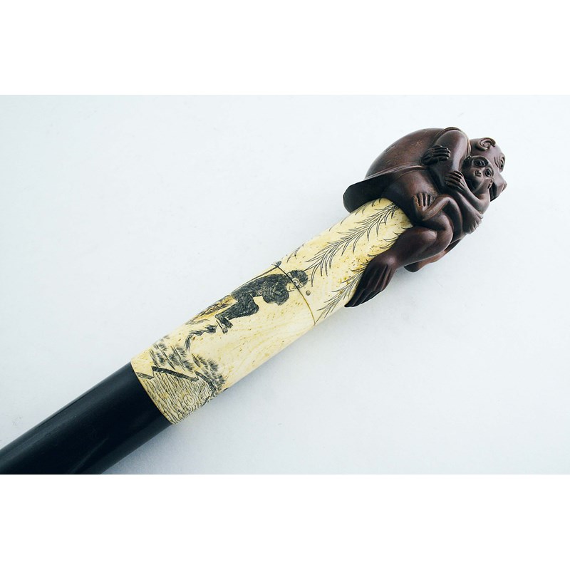 with a thick, ebonised shaft & a horn tip, the handle of bone and red hardwood, carved with monkeys forming the knop and engraved with monkeys at play; 36.5" (93 cms) long