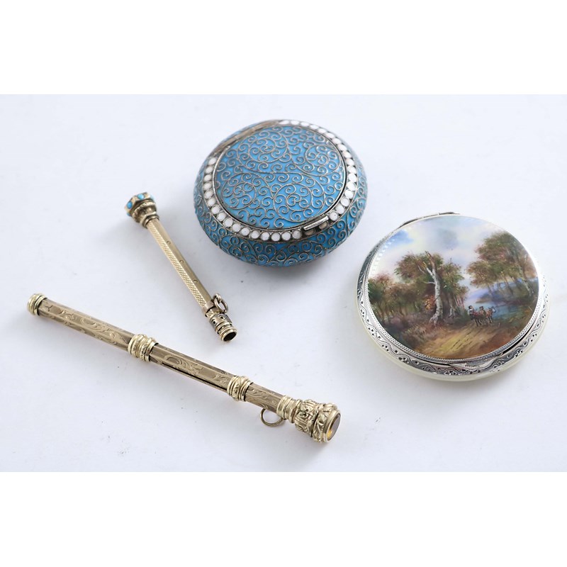 of compressed circular form with a turquose ground and a white pelleted borders, with State marks for Moscow 1896-1908, a Continental enamelled circular powder compact and two Victorian gold-cased "column" pencils; the Russian box 2.1" (5.2 cms) diameter; 1.6 oz weighable silver (4)