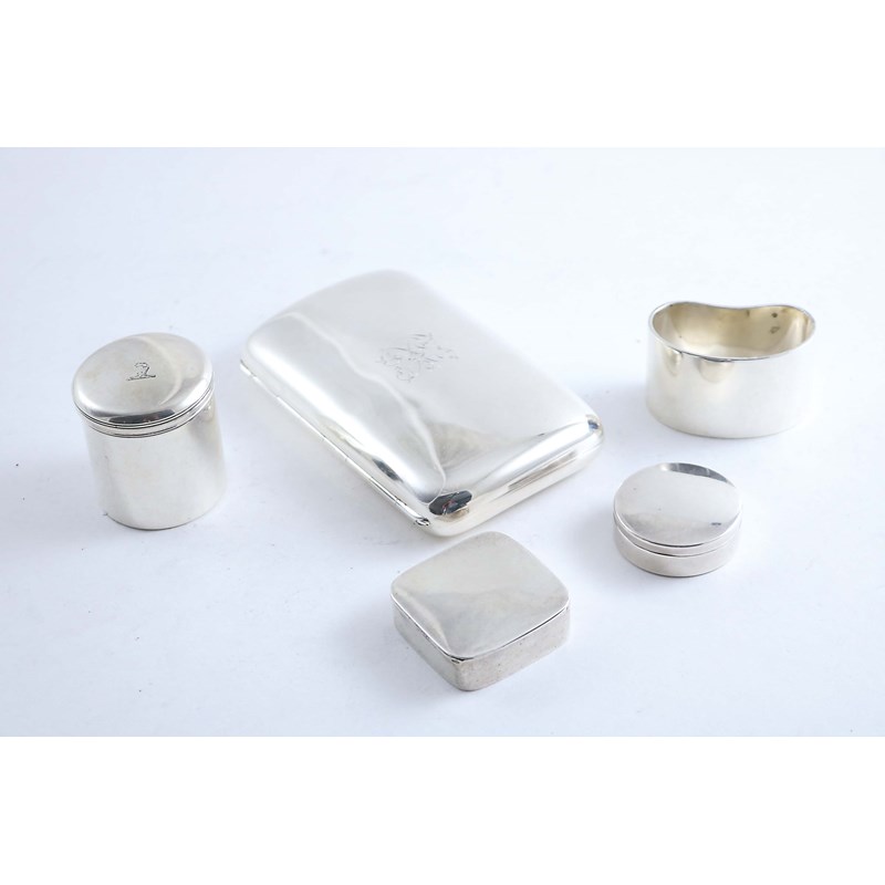 of rounded oblong form, Chester 1888, a kidney-shaped napkin ring, two small pill boxes and a George III cylindrical toilet box, crested, by T. Phipps & E. Robinson, London 1789; the latter 2" (5 cms) high; 10.6 oz (5)