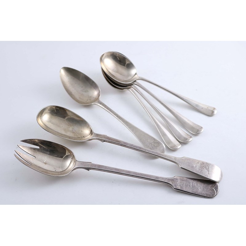 crested, by Francis Higgins, London 1884, a George III table spoon, initialled, and a set of four early 20th century Hanoverian pattern soup spoons; the servers 10.55" (27 cms) long; 22.3 oz (7)