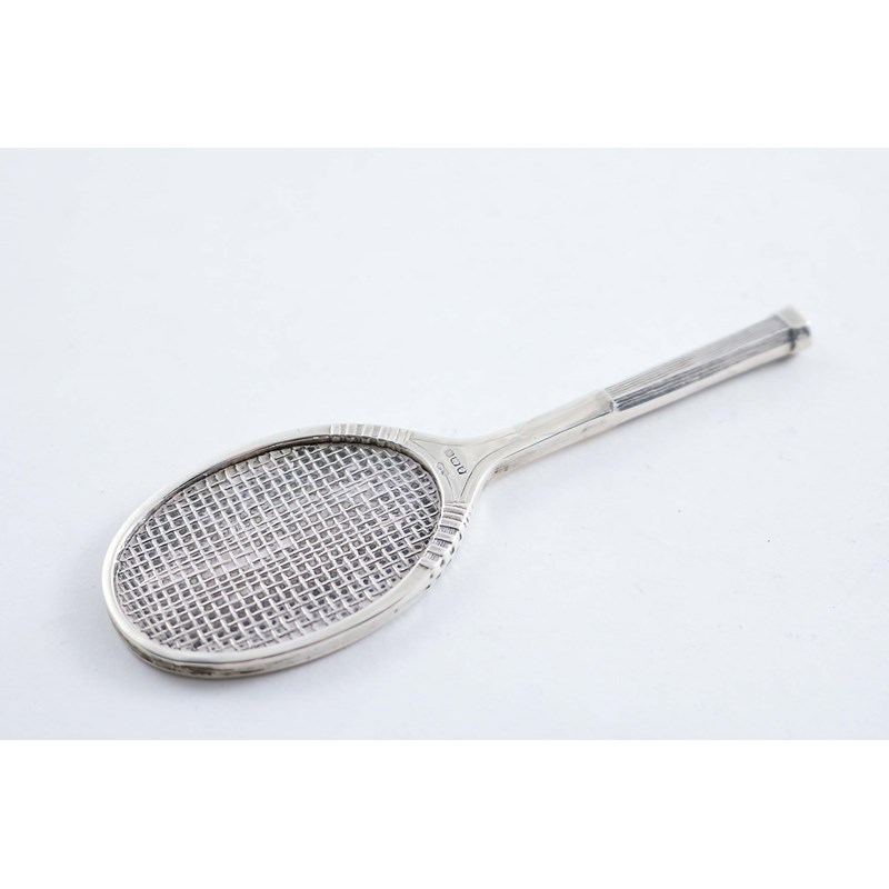 AN EARLY 20TH CENTURY SMALL NOVELTY VANITY MIRROR in the form of a tennis racket, by Sanders and Mackenzie, Birmingham 1925; 5" (12.7 cms) long; 0.5 oz gross