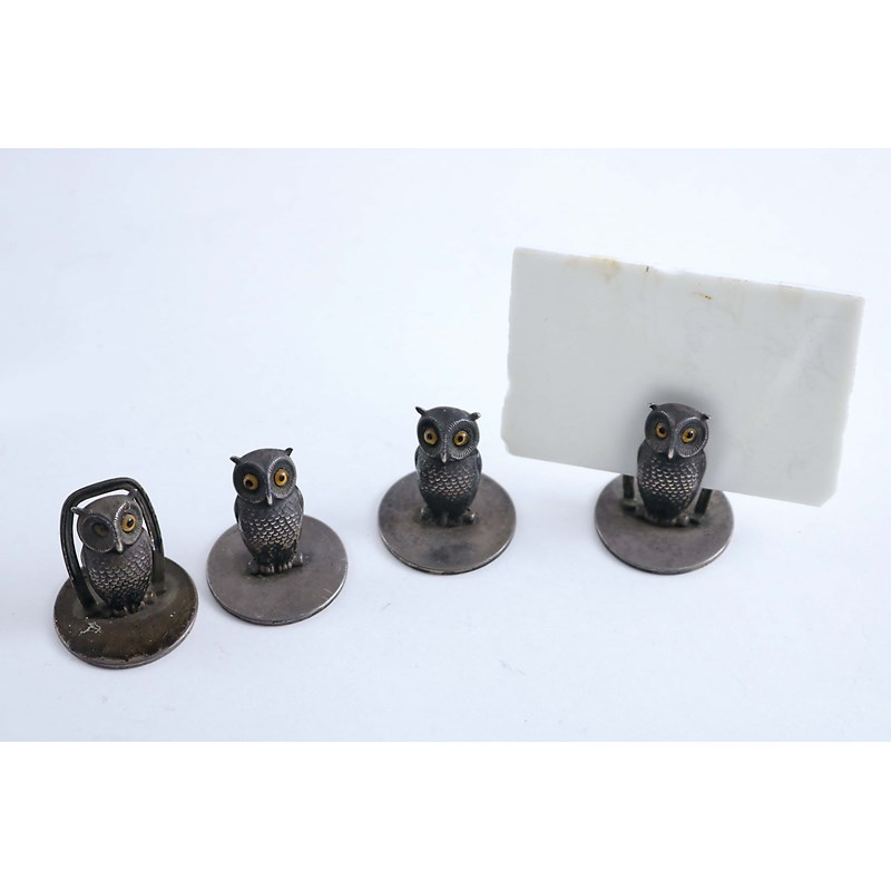 in the form of owls with coloured glass eyes, and another pair with slightly different clips (one lacking one eye), all by S. Mordan & Co., Chester 1909; 1.25" (3 cms) high; 2.7 oz (4)