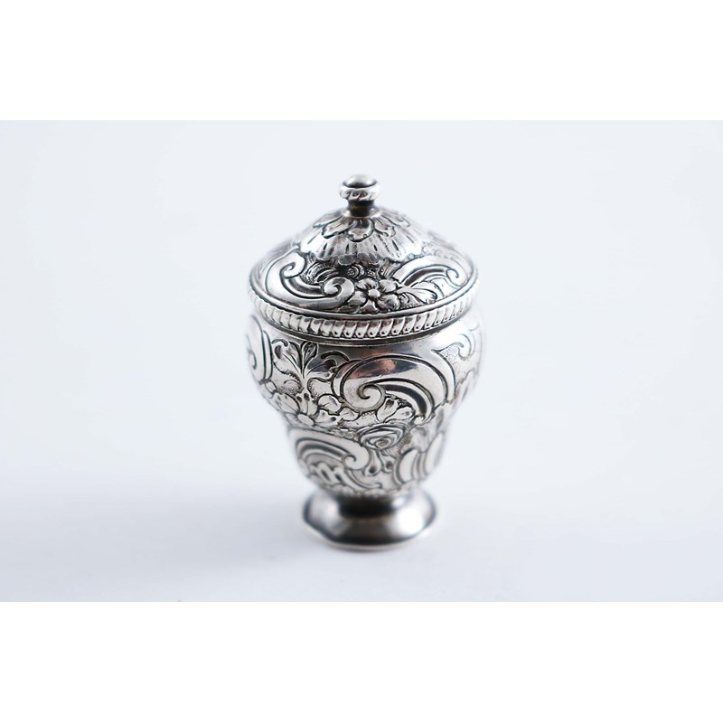 in the form of an urn with chased rocaille decoration, a circular foot & a screw cover revealing a lift-out grater, maker's mark only (indistinct); 1.7" (4.4 cms) high; 0.5 oz