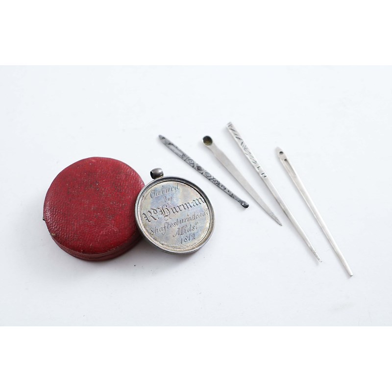 inscribed to "Rd.Burman Shaftesbury Acady. Midsr. 1812" (fitted case), by Joseph Ash, London 1812, a bodkin, by Samuel Pemberton, Birmingham c.1800, another bodkin, a steel bodkin and a broken, early 17th century bodkin; the medal 1.4" (3.5 cms) diameter (5)